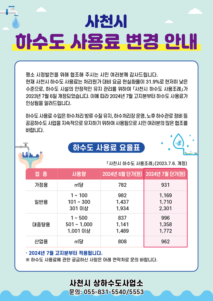 | ▲하수도 사용료 변경 안내 안내문(사진=사천시) |