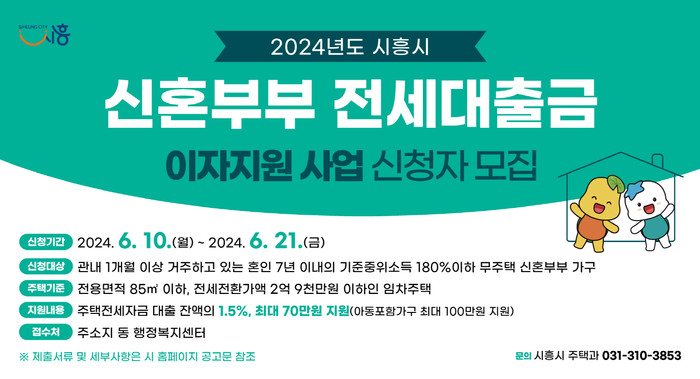 | ▲2024년 시흥시 신혼부부 전세대출금 이자지원 사업 신청자 모집 포스터(사진=시흥시) |