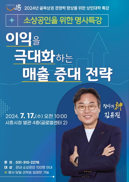 이번 강의에는 ‘장사의 신’으로 유명한 김유진 외식업 컨설턴트가 초빙돼 ‘이익을 극대화하는 매출 증대 전략’을 주제로 시흥시 소상공인들의 경쟁력 향상을 도울 예정이다.