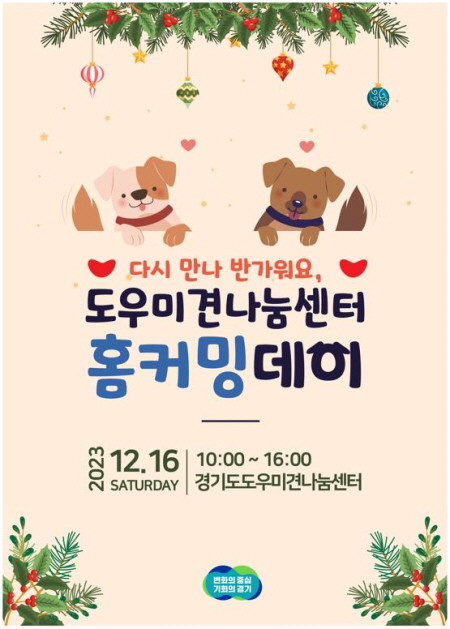 [프레스뉴스] 김대일 기자= 경기도가 12월 16일 도우미견나눔센터(화성시 마도공단로1길 181-15)에서 반려동물 입양문화 활성화 및 도우미견나눔센터 개관 10주년 기념 ‘다시 만나 반가워요, 도우미견나눔센터 홈커밍데이’를 개최한다.