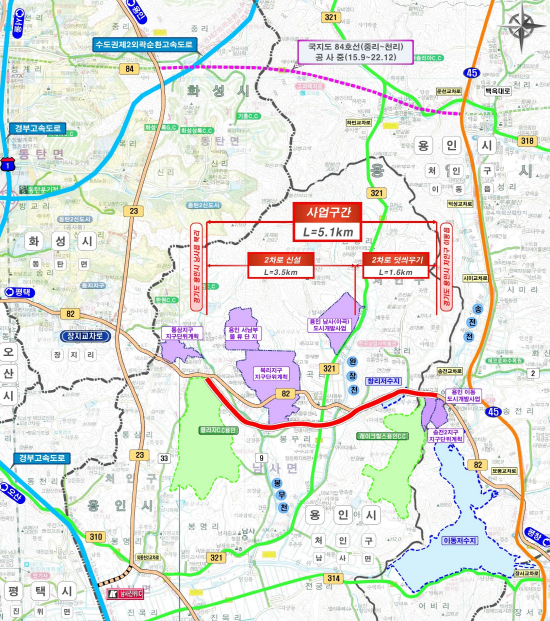 용인 장지-남사 국가지원지방도 도로건설공사는 용인시 처인구 남사읍 북리에서부터 이동읍 송전리까지 총 5.1㎞ 구간에 2차로 신설(3.5㎞) 및 2차로 덧씌우기(1.6㎞)를 추진하는 사업으로 총사업비 789억 원이 투입될 예정이다.