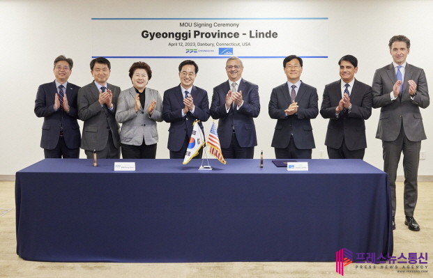 | ▲ 지난 4월 12일 오후 미국 코네티컷주에서 김동연 경기도지사가 산지브 람바(Sanjiv Lamba) 린데 CEO와 MOU협약서에 서명을 하고 기념촬영을 하고 있다.(사진=경기도) |