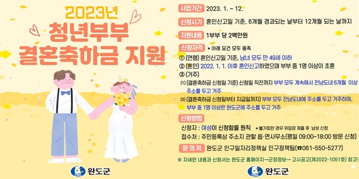 | ▲ 완도군, 청년 부부 결혼 축하금 지원 안내(사진제공=완도군) |