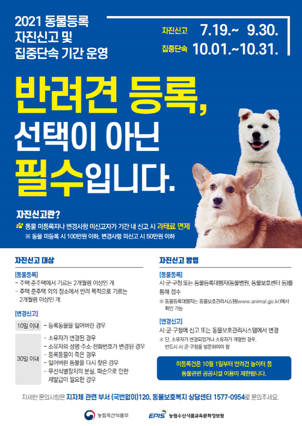 특히 자진신고 기간이 지난 후 10월부터 반려견 주요 출입지역 및 민원 빈발지역에 대한 집중단속을 벌이고, 반려견 놀이터 등 지자체 운영시설의 미등록동물 이용 제한 등의 조치로 적극적인 동참을 유도할 방침이다.