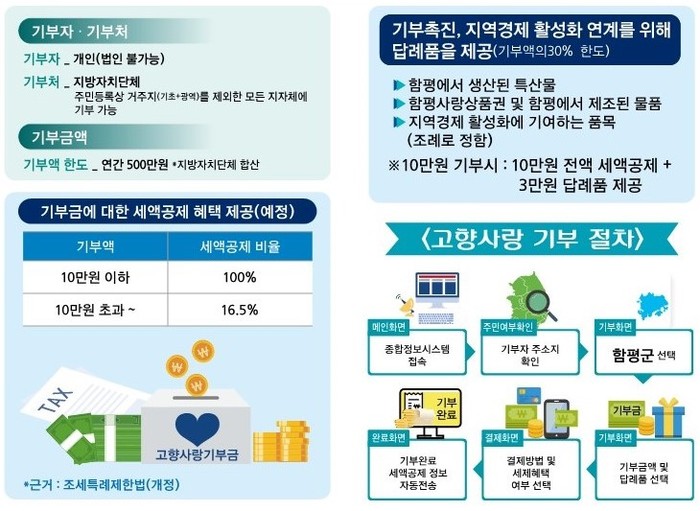 함평군에 따르면 시행 첫날인 지난 1일부터 4일까지 나흘간 총 21명이 679만원을 기부하며 고향 사랑을 실천했다.