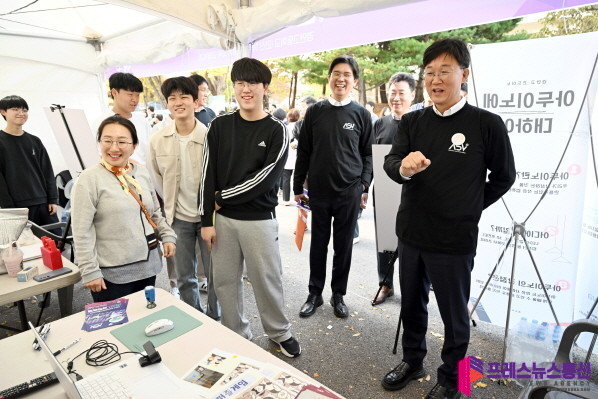 | ▲이민근 안산시장(오른쪽 첫번째)이 지난해 11월 7일 한양대 ERICA캠퍼스에서 열린 ASV과학축제 참여 부스(경안고등학교 운영)를 방문하고 있다.(사진=안산시) |