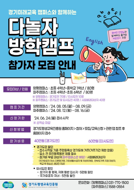 방학캠프 접수는 경기도평생교육진흥원 누리집을 통해 온라인으로 신청을 받는다. 방학캠프관련 자세한 사항은 누리집과 미래교육캠퍼스(파주 ☎1588-0554, 양평 ☎031-770-1500)으