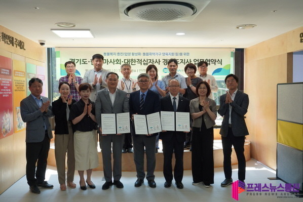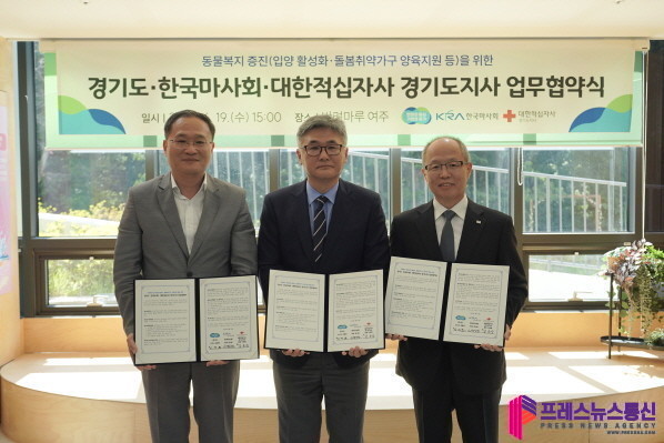 [프레스뉴스] 류현주 기자= 경기도는 19일 반려마루 여주에서 한국마사회, 대한적십자사 경기도지사와 ‘유기·반려동물 물품꾸러미 지원사업’ 업무협약을 맺고 돌봄취약가구의 반려동물 양육지원과 유기동물 입양 활성화 등에 협력하기로 했다.