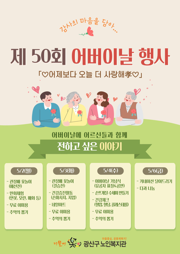 [광주=프레스뉴스] 강래성 기자= 제50회 어버이날을 맞이하여 광산구 노인복지관(더불어락, 행복나루 노인복지관)이 5월 첫째 주 경로효친 주간 기념행사를 개최한다.