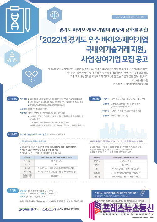 [프레스뉴스] 장현준 기자= 경기도와 경기도경제과학진흥원(이하 경과원)이 도내 바이오·제약기업의 투자 활성화를 위해 ‘인터비즈 바이오 파트너링&투자포럼 2022’와 ‘바이오플러스 인터펙스 코리아 2022’ 참여기업을 모집한다고 30일 밝혔다.