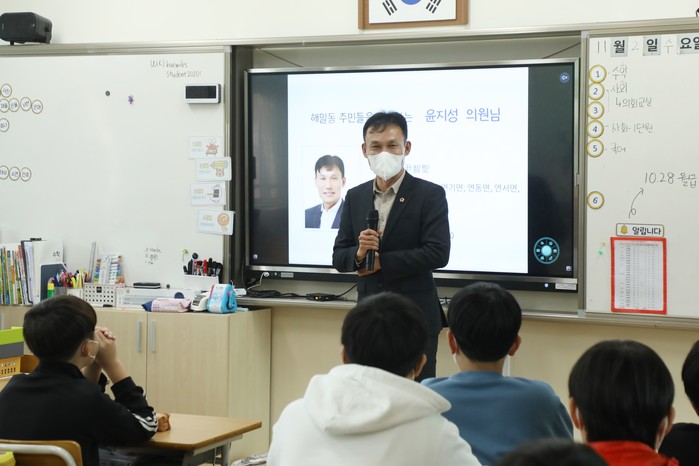 ▲세종시의회 윤지성의원이 지난 1일부터 3일까지 사흘 동안 해밀초등학교를 방문해 찾아가는 의회교실을 진행했다.(사진=세종시의회) |