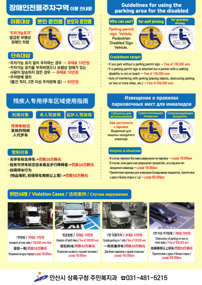 이에 구는 한국어로만 제작된 장애인전용주차구역 홍보물에 영어·중국어·러시아어 등 3개 언어를 추가해 외국인 밀집지역에 현장계도 활동 시 중점 배부할 예정이다.