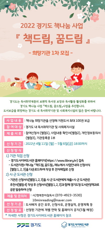 신청 기간은 5월 6일 오후 6시까지며 희망 기관이 경기도사이버도서관 누리집에 접속해 신청서를 작성 후 전자우편으로 제출하거나, 시·군 공공도서관 추천을 통해 접수할 수 있다. 자세한 사항은 경기도사이버도서관 누리집 공지 사항을 참고하거나 전화로 문의하면 된다.