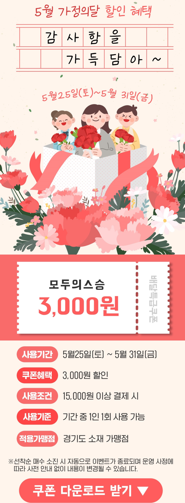 [프레스뉴스] 류현주 기자= 어린이날, 어버이날, 스승의날, 부부의날 등 가정의 달 5월에 배달특급도 소비자분들에게 감사의 마음을 전하고자 소비자 할인 이벤트를 마련했다.