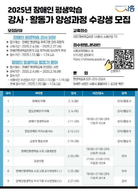 [프레스뉴스] 장현준 기자= 시흥시(시장 임병택)는 1월 13일부터 24일까지 관내에서 활동하는 평생교육 강사와 장애인 평생학습 프로그램에 관심 있는 시민을 대상으로 2025년 장애인 평생학습 전문 강사·활동가 양성과정 수강생을 모집한다.
