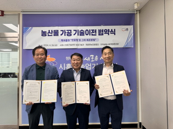 [프레스뉴스] 장현준 기자= 시흥시 농업기술센터는 지난 26일 농업기술센터 소회의실에서 농업기술과가 자체 개발한 ‘연꽃청 및 그의 제조방법’ 기술 이전 협약을 갯골영농조합법인, 지역살림사회적협동조합과 체결했다.