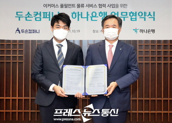 [프레스뉴스] 김대일 기자= 하나은행(은행장 박성호)은 이커머스 전문 풀필먼트(Fulfillment) 서비스 솔루션 제공 업체 ㈜두손컴퍼니(대표 박찬재)와 이커머스 및 D2C(Direct-to-Consumer) 시장 활성화를 위한 업무협약을 체결하고 다양한 제휴에 나선다고 밝혔다.