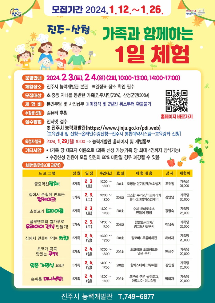 이번 체험행사는 8개 프로그램별 5가족씩 모집하여 진주·산청 지역 40가족 160여 명이 참여하게 되며 오는 2월 3일 토요일과 4일 일요일 오전 10시부터 오후 1시, 오후 2시부터 5시까지 운영한다.