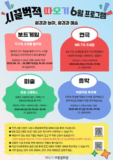 따오기아동문화관은 매월 다른 주제를 선정해 다양한 체험형 문화 프로그램을 운영해 오고 있으며, 6월에는 ‘환경’을 주제로 한 보드게임, 연극놀이, 음악극, 미술놀이 등이 진행된다. 특히 예술놀이 중심의 접근을 통해 아이들이 자연스럽게 환경 문제에 관심을 가질 수 있도록 구성했다.