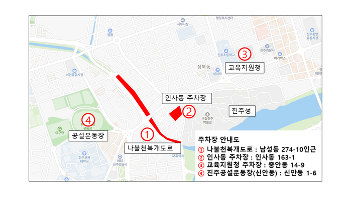 임시주차장의 위치는 나불천 복개도로(남성동 274-10 인근), 인사동 공용주차장(인사동 163-1), 교육지원청 주차장(중안동 14-9), 진주공설운동장(신안동 1-1)이다.