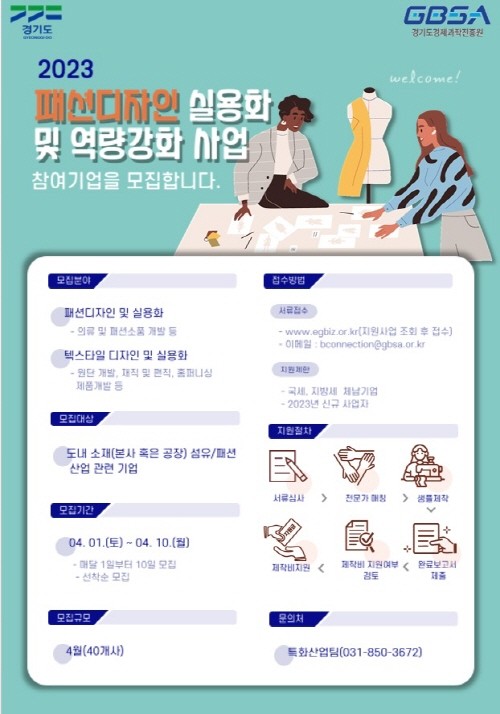 [프레스뉴스] 김대일 기자= 경기도와 경기도경제과학진흥원(이하 경과원)은 ‘2023 패션디자인 실용화 및 역량강화 사업’을 추진하고 사업에 참여할 도내 섬유·패션 관련 기업을 모집한다고 27일 밝혔다.