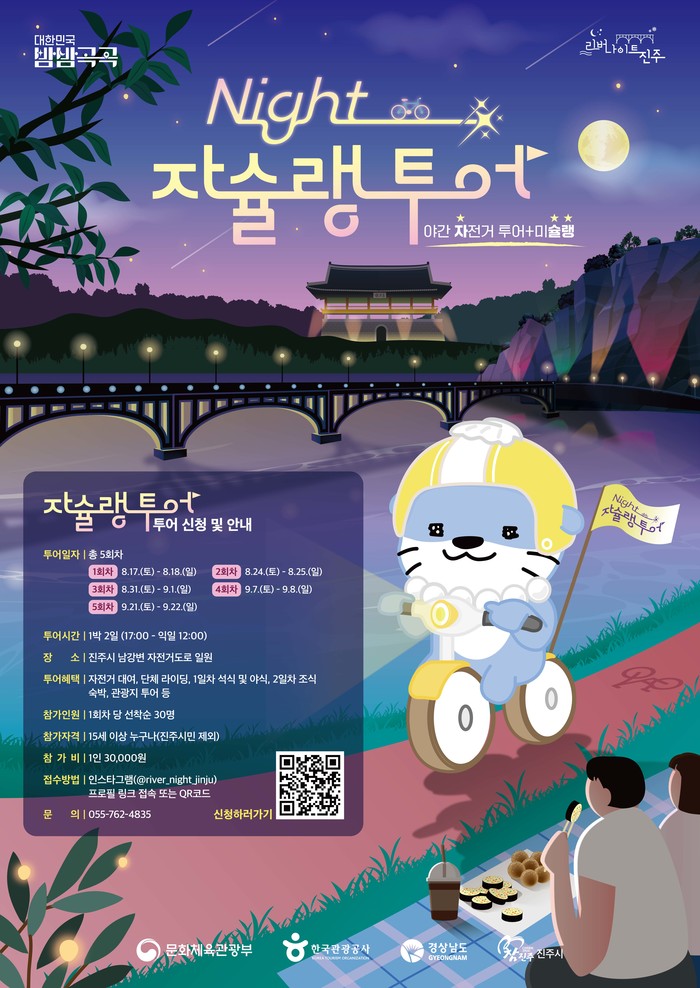 야간관광 특화도시이자 명품 자전거도시 진주에서 펼쳐지는 이번 투어에는 자전거 대여와 단체 라이딩, 관광지 관람, 진주 음식 도시락, 숙박, 버스킹 공연 등 알찬 콘텐츠가 제공된다.