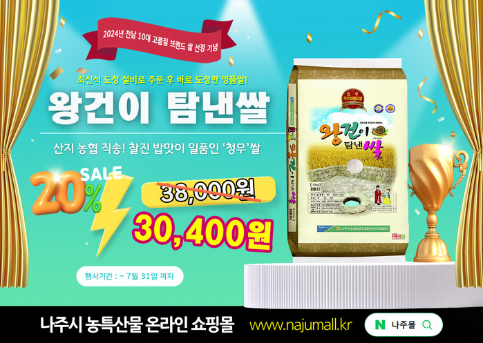 나주시는 ‘왕건이 탐낸 쌀’이 지난해에 이어 올해까지 2년 연속 전남 10대 브랜드 쌀에 선정되면서 특판행사를 마련했다. 7월 한 달간 정상가 대비 20% 할인된 가격에 무료 배송 서비스도 받아볼 수 있다.