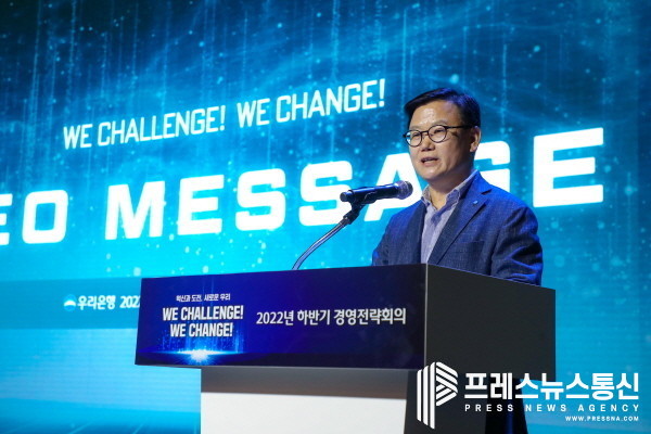 | ▲ 우리은행(은행장 이원덕)은 지난 22일 우리은행 본점 비전홀에서 ‘2022년 하반기 경영전략회의’ 를 개최했다. 이원덕 우리은행장이 ‘WE CHALLENGE! WE CHANGE!’ 라는 슬로건을 제시하며 올바른 윤리의식과 이를 정립할 수 있는 강한 제도를 확립해야 한다고 강조하고 있다.(사진=우리은행) |