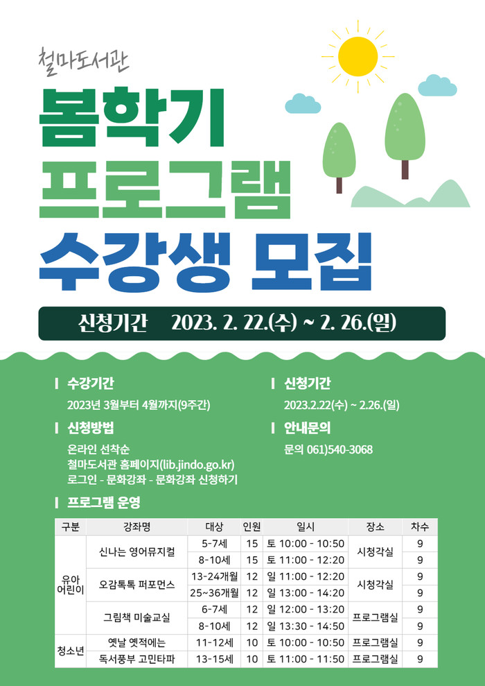 | ▲ 철마도서관, 봄학기 프로그램 운영 안내문(사진제공=진도군) |