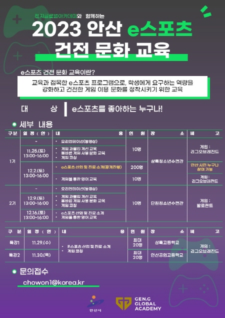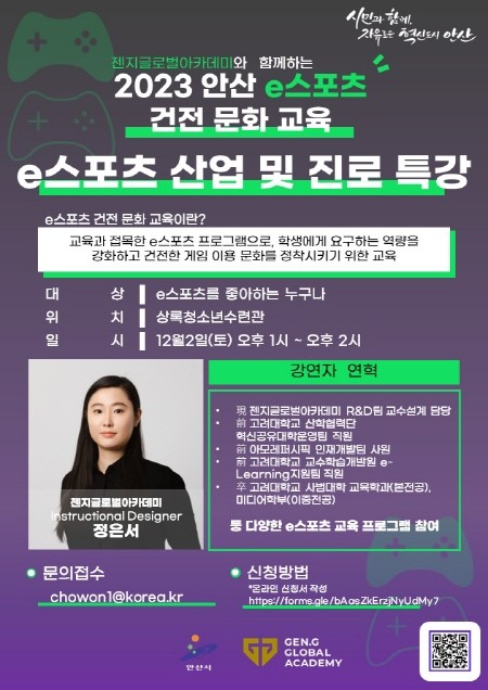특히, 다음달 2일에는 e스포츠에 관심 있는 시민을 대상으로 상록청소년수련관에서 젠지글로벌아카데미 정은서 강사의 ‘e스포츠 산업 및 진로’에 대한 특강이 개최될 예정이다. 참여희망자는 포스터에 있는 QR코드를 통해 신청하면 된다.