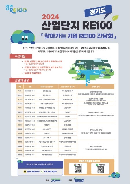간담회는 산업단지 입주기업 외에 개별입지 기업에서도 참여할 수 있으며, 온라인 사전등록은 원스톱 상담센터인 ‘경기도 기업 RE100’ 카카오톡 채널을 통해서도 가능하다.