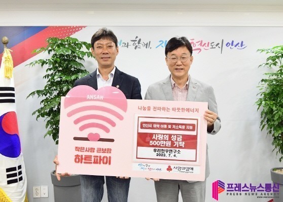 [프레스뉴스] 장현준 기자= 안산시(시장 이민근)는 지난 4일 우리한우연구소(대표 김병도)로부터 저소득층을 위한 후원금 500백만 원을 기탁 받았다고 5일 밝혔다.