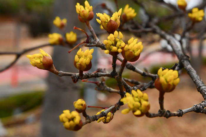 | ▲25일 경북 포항시 남구 철길 숲 도로 인근에서 산수유가 꽃망울을 터뜨리고 있다./사진-뉴스1 |
