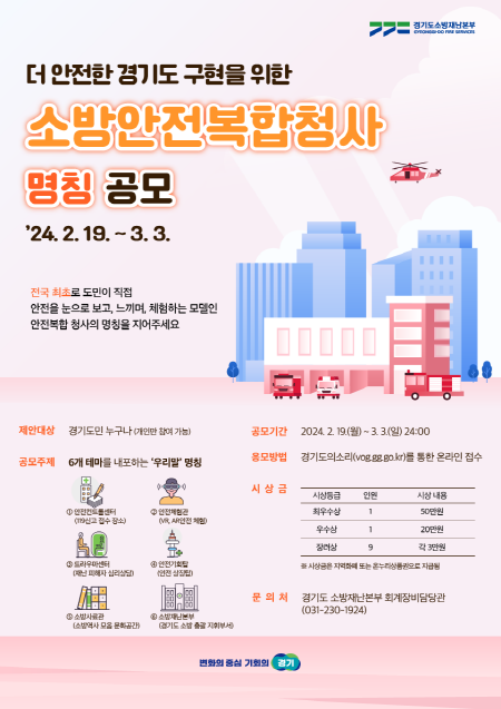 소방안전복합청사 명칭 공모에는 희망하는 경기도민이라면 누구나 참여할 수 있으며 3월 3일까지 ‘경기도의 소리 누리집’에 접속해 원하는 명칭을 접수하면 된다.