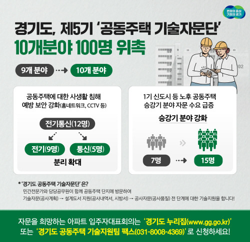 [프레스뉴스] 장현준 기자= 경기도는 공동주택 입주민에게 더 안전한 주거환경을 제공하기 위해 민간자문가들로 구성된 공동주택 기술자문단에 제5기 자문위원 100명을 위촉했다고 21일 밝혔다.