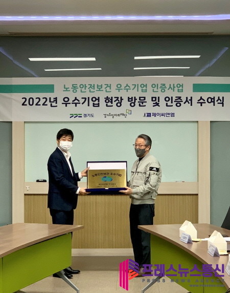 경기도는 지난 21일 오산 제이씨앤엠 주식회사에서 배진기 경기도 노동권익과장, 조은주 경기도일자리재단 본부장, 인증 업체 대표 등 10여 명이 참여한 가운데 ‘2022년 경기도 노동안전보건 우수기업 인증서 수여식’을 열었다.