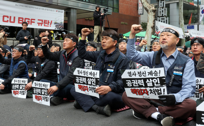 | ▲전국민주노동조합총연맹(민주노총) 공공운수노조 화물연대 관계자들이 28일 서울 강남구 BGF리테일 본사 앞에서 열린 '원청교섭 회피 CU BGF 규탄! 민주노총 결의대회'에서 구호를 외치고 있다. /사진=뉴스1 |