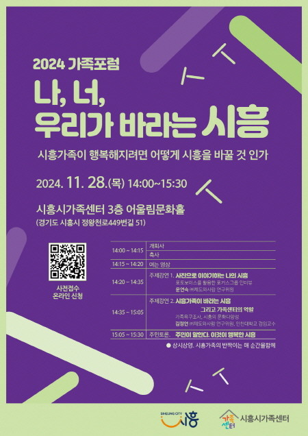 포럼에 참석을 희망하는 시민과 기관은 11월 25일까지 온라인 사전 등록을 통해 신청할 수 있다. 참여 신청은 포스터에 기재된 큐아르(QR) 코드에 접속해서 하면 된다. 자세한 사항은 시흥시가족센터 누리집, 인스타그램, 카카오톡 채널 등을 통해 확인할 수 있다.