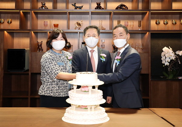 ▲ 하나금융그룹은 프리미엄 자산관리 브랜드『Club1(클럽원)』을 한남동에 개점하고 18일 오후에 개점식 행사를 가졌다. 박성호 하나은행장(사진 가운데)이 하나은행 Club1한남PB센터 유보영 지점장(사진 왼쪽)과 하나금융투자 Club1한남WM센터 김창수 지점장(사진 오른쪽)과 함께 개점식 행사에서 축하 케익 커팅을 하고 있다.(사진=하나은행) |
