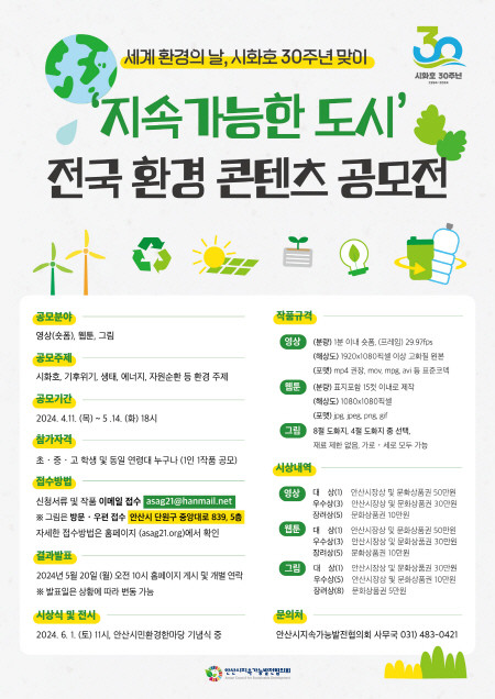 공모전에 대한 자세한 사항은 안산시청 또는 안산시지속가능발전협의회 누리집(홈페이지)에서 확인하거나 전화로 문의하면 된다.
