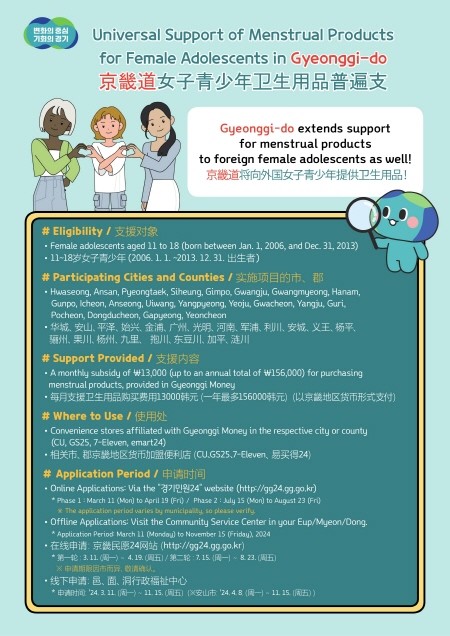 지난해 10월 ‘경기도 여성청소년 생리용품 지원에 관한 조례’ 개정에 따라 올해부터는 도내 등록외국인과 국내거소신고 외국국적동포 여성청소년에게도 생리용품 구입비를 지원한다.