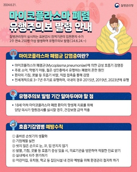 올해 마이코플라스마 유행주의보가 최초로 발령되면서 질병관리청은 호흡기감염병을 진료하는 내과, 소아청소년과, 이비인후과를 포함한 의료기관을 대상으로 마이코플라스마 폐렴균 항원검사를 적극 활용하도록 안내하고 있다.
