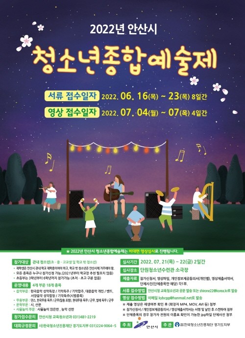 안산시가 주최하고 사단법인 한국청소년진흥재단 경기도지부가 주관하는 예술제는 코로나19 예방을 위해 청소년들의 경연 모습이 담긴 영상을 제출받아 비대면 심사를 진행한다.