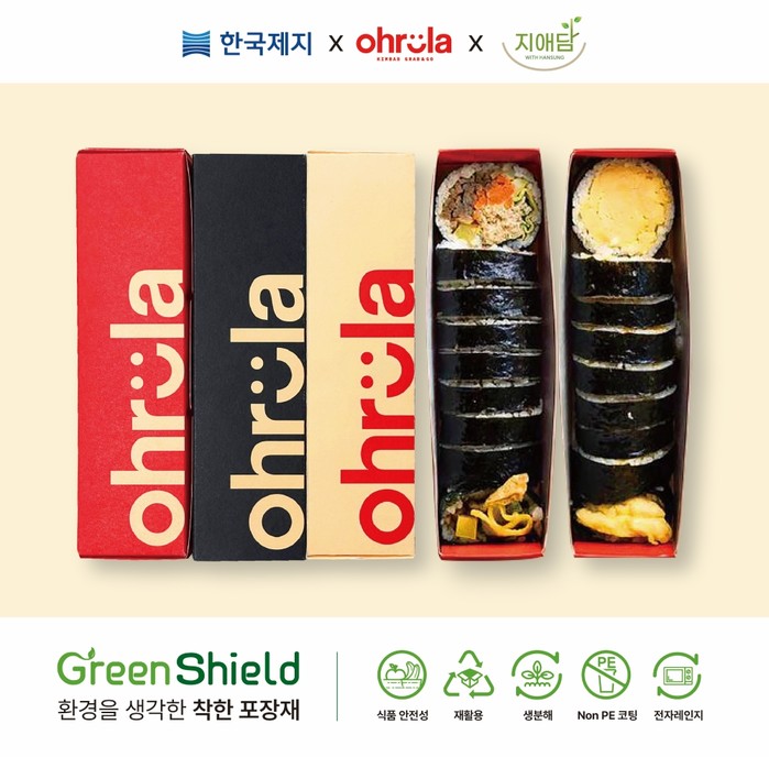 한편 한국제지 그린실드는 플라스틱 코팅을 대체한 친환경 코팅 기술을 갖춘 포장재로 재활용이 가능하며 매립 시 3개월 안에 생분해된다. 국내에서는 오로라김밥과 더불어 롯데시네마, BHC, 대한항공, 아워홈 등 다양한 브랜드와 협업하며 ESG 경영 실천에 앞장서고 있으며, 최근 미국 아이스크림 브랜드 소미소미에 납품을 시작하며 국내외 시장에서도 친환경 이미지를 강화하고 있다.