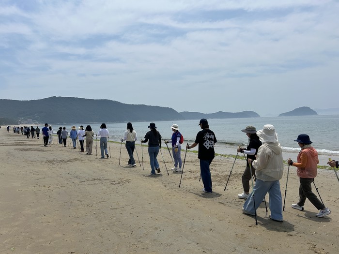 | ▲완도군, 전남 22개 시군 치매안심센터 직원 대상 해양치유 프로그램 진행(해변 노르딕 워킹)(사진제공=완도군) |