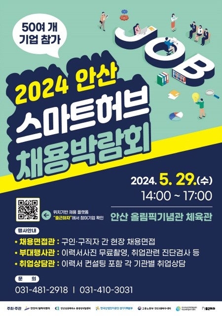 ’2024 안산 스마트허브 채용박람회‘는 안산시와 안산 고용복지플러스센터, 중장년내일센터, 한국산업단지공단 경기지역본부, 안산새일센터 등 안산지역 일자리 유관기관들이 공동으로 협업해 진행하는 행사로 50여 개의 우수기업체가 참여한다.