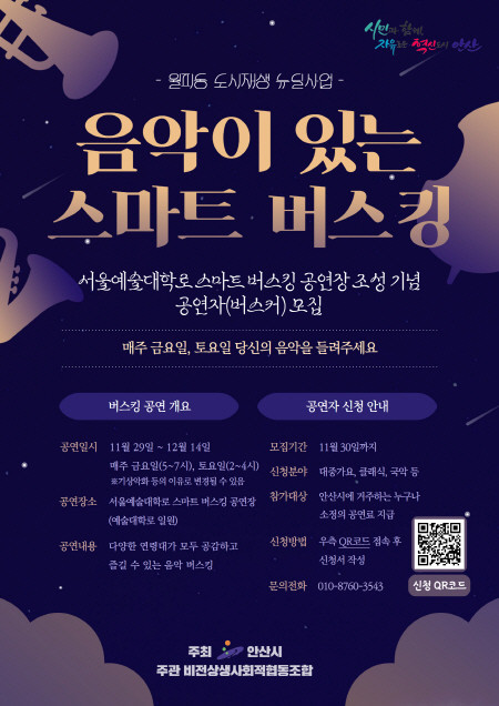 한편, ‘예술대학로 스마트 버스킹 공연장’은 지난 2021년 국토교통부 ‘생활밀착형 도시재생 스마트기술 지원사업’ 및 ‘월피동 도시재생 뉴딜사업’의 일환으로 조성됐다. 스마트 버스킹 플랫폼을 활용해 영상 촬영과 음향 지원, 녹화, 라이브 송출 등이 가능하다. 모든 시민은 안산시 통합예약시스템 버스킹 누리집을 통해 원스톱(▲공연 예약 ▲신청 ▲승인 ▲공연 등)으로 이용할 수 있다.
