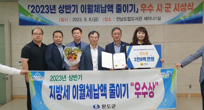 [전남=프레스뉴스] 박정호 기자= 전남 완도군은 지난 9월 8일 전라남도가 주관하는 ‘2023년 상반기 지방세 이월 체납액 줄이기’ 평가에서 우수 기관 표창을 받았다.