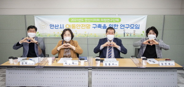▲ 지난 5월 10일 ‘안산시 아동안전망 구축을 위한 연구모임’ 회의를 마치고 기념촬영에 임하고 있는 김태희 이경애 김동수 김진숙 의원(사진 왼쪽부터 차례대로)의 모습. (사진=안산시의회) |