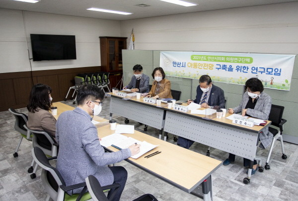 ▲ 안산시의회 의원연구단체 ‘안산시 아동안전망 구축을 위한 연구모임’ 소속 의원들이 최근 국가인권위원회가 주관한 ‘아동보호를 위한 지방의회 의원·지자체 관계 공무원 인권역량 향상과정’ 교육에 온라인으로 참여했다. 사진은 지난 5월 10일 의회 소회의실에서 있었던 ‘안산시 아동안전망 구축을 위한 연구모임’의 회의 모습. (사진=안산시의회) |